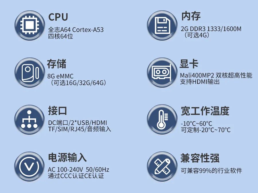 標配全志A64Cortex-A53四核64位處理器,2G DDR3 8G eMMC 搭配Android6.0系統(tǒng),支持本地SD、USB升級。